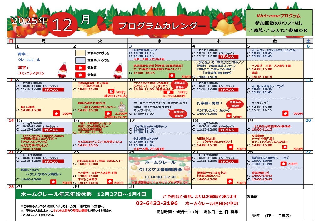 | ダンスエクササイズ | 60分 | 講師はプロのダンサー。アップテンポな音楽に合わせて踊るエクササイズです。椅子に座ったままでもOK! |