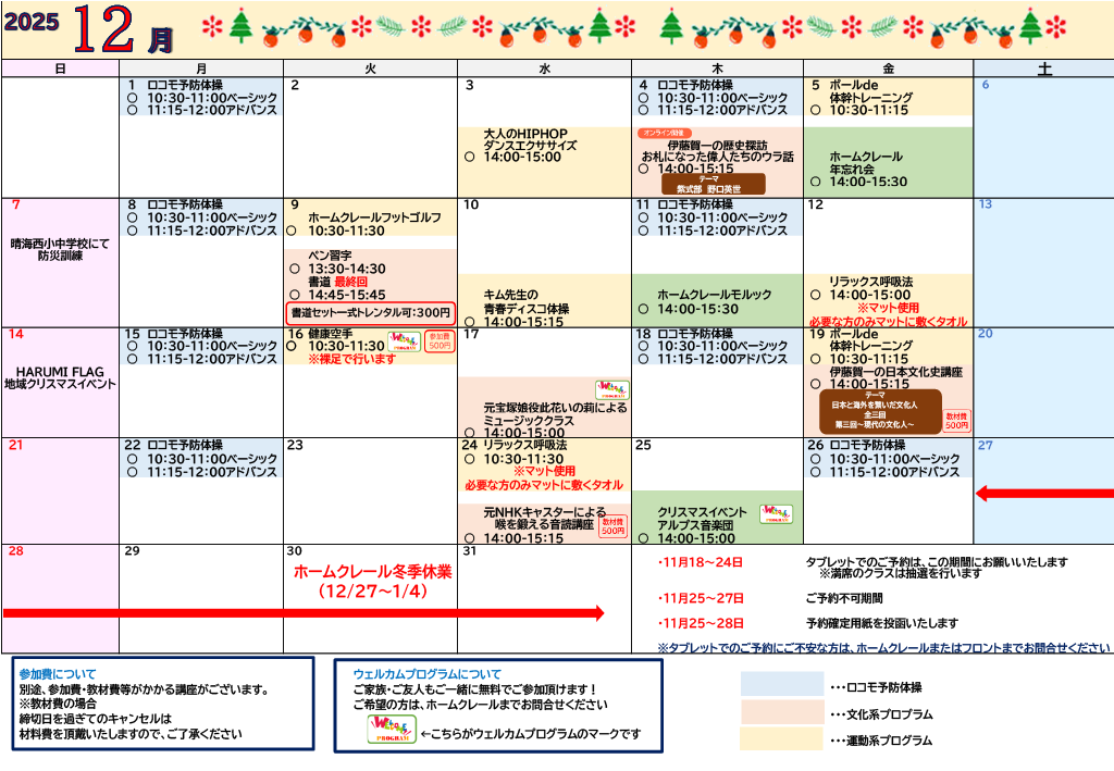 | ダンスエクササイズ | 60分 | 講師はプロのダンサー。アップテンポな音楽に合わせて踊るエクササイズです。椅子に座ったままでもOK! |