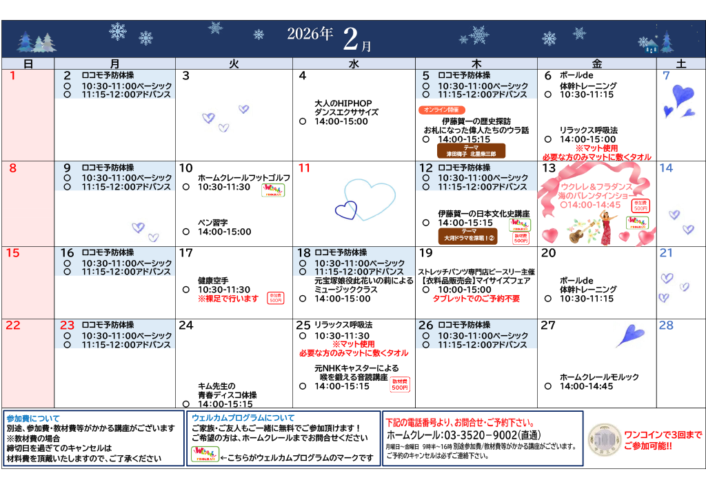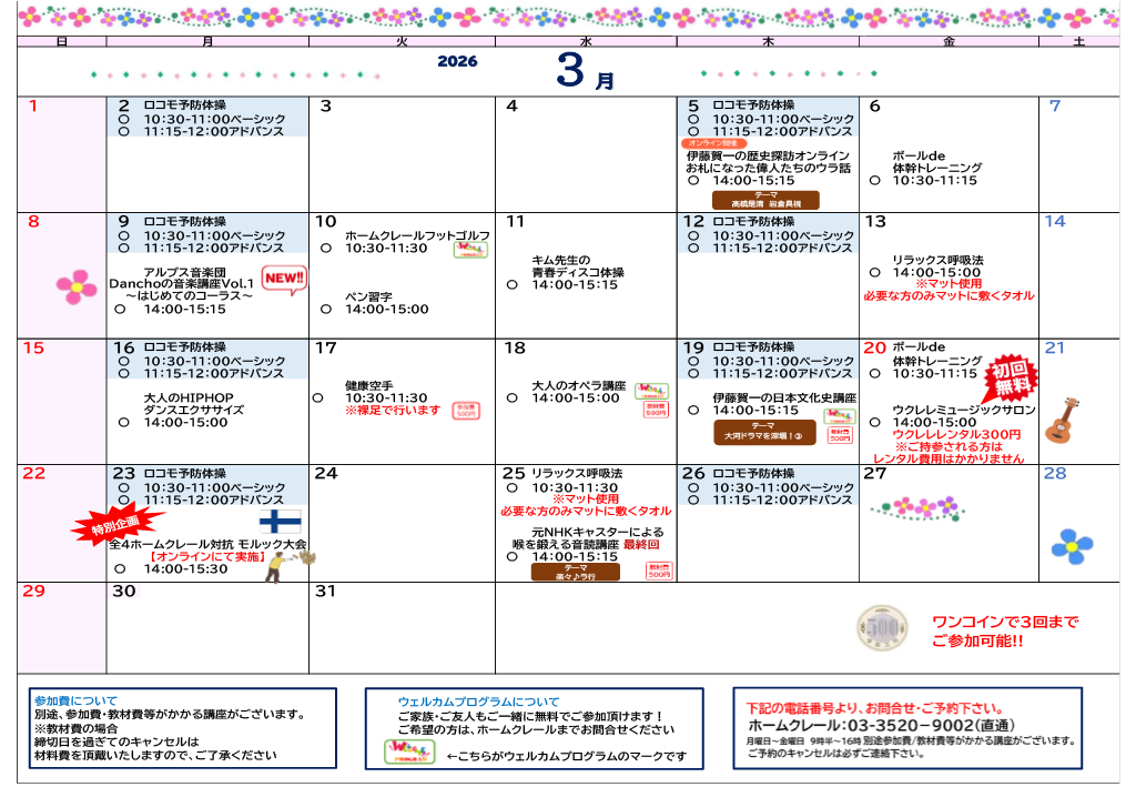 | 宝塚OGによるミュージッククラス | 60分 | 宝塚OGの講師による音楽を楽しむクラス。発声練習から始まり、ミュージカルソングを中心に、なじみのある曲を楽しく歌います。 |